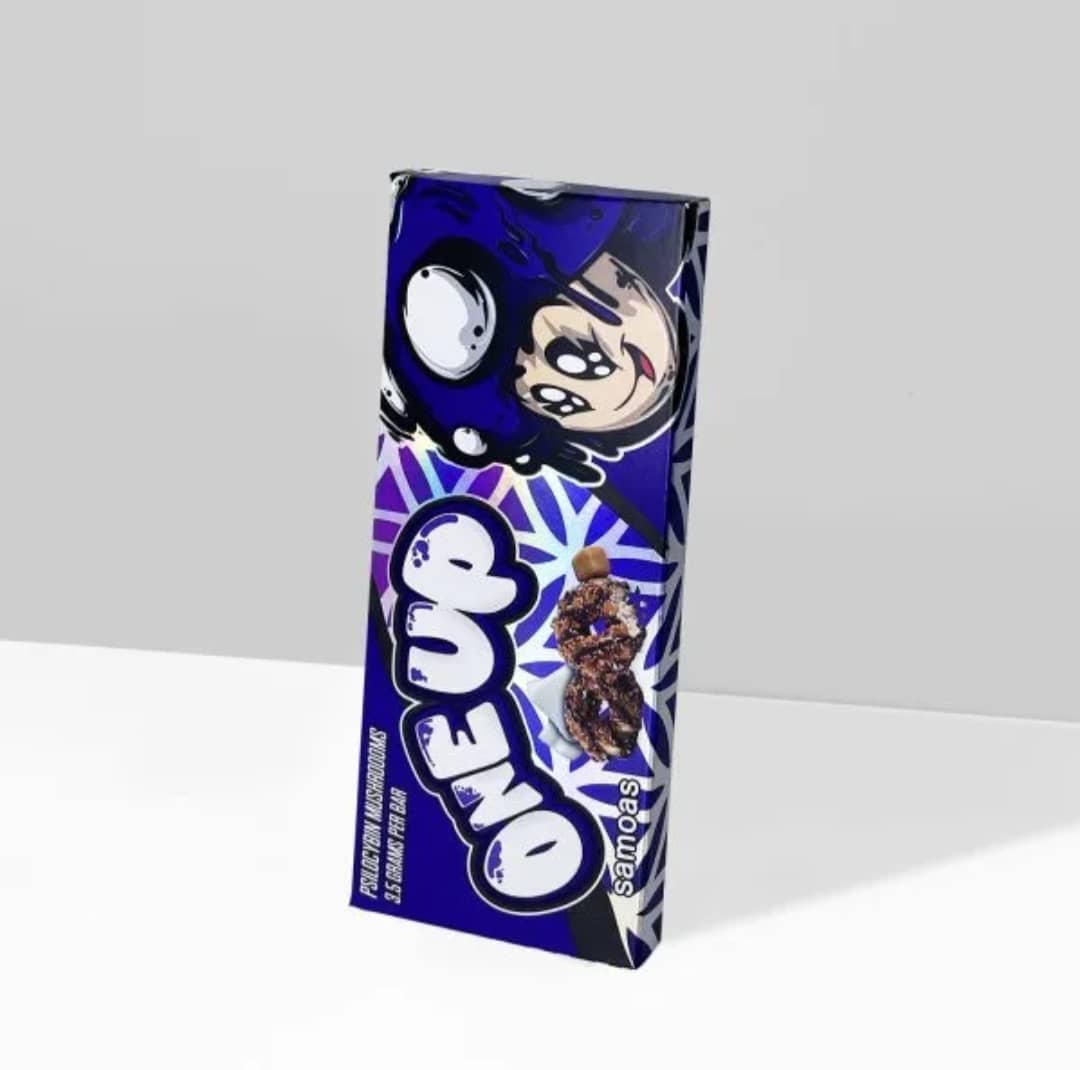 Infused with the rich flavors of Samoas mushrooms, the One Up Samoas chocolate bar offers a unique and delightful twist on traditional chocolate confections. Each bite reveals a harmonious blend of velvety smooth chocolate and the earthy notes of the Samoas mushroom, creating a truly extraordinary taste experience.